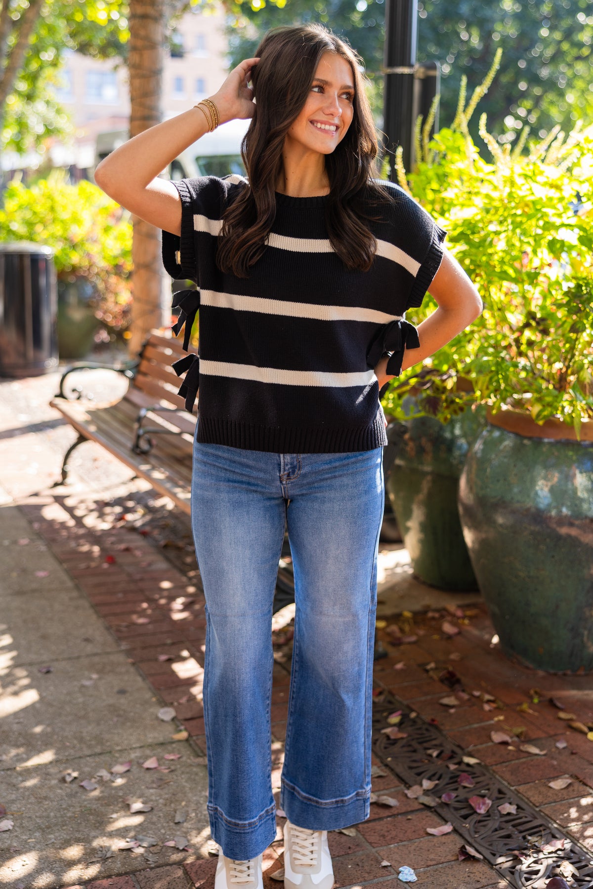 Stripe double side tie short sleeve, drop shoulder sweater in cream and black