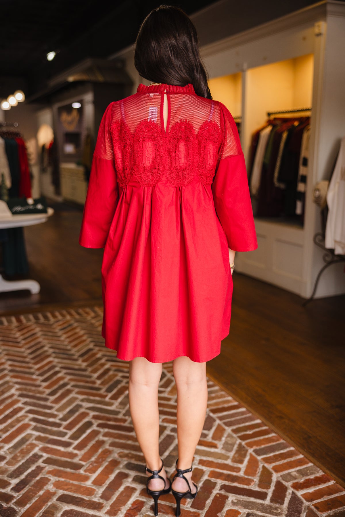 Burgundy crochet lace trim dress, 3/4 sleeve with mesh contrast, side pockets and back button close