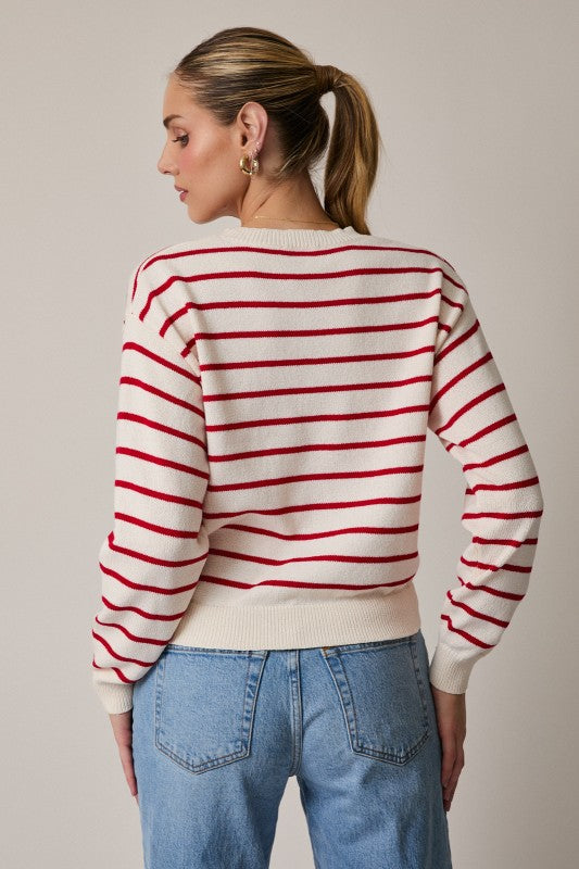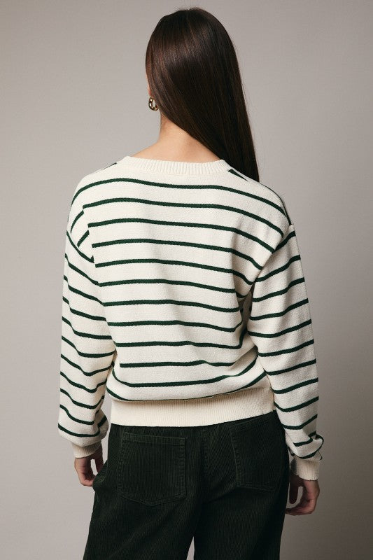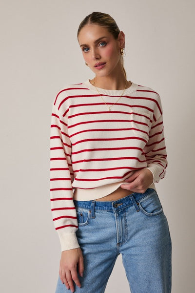 Striped long sleeve, drop shoulder sweater with a front pocket